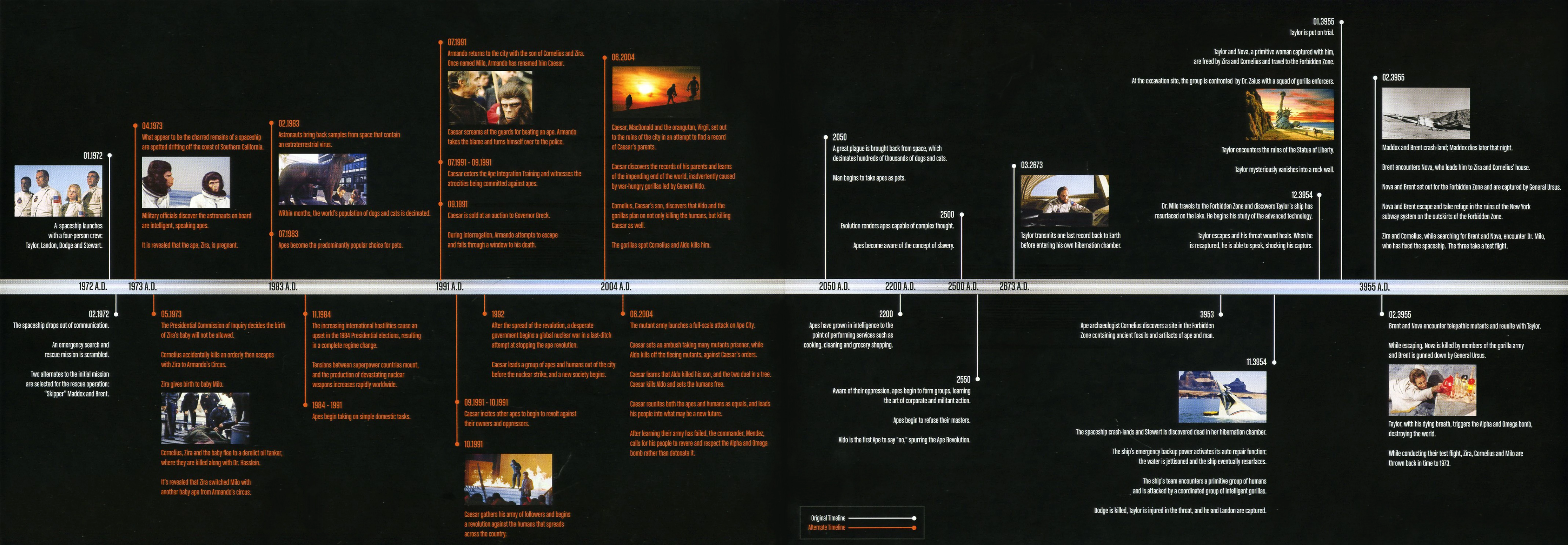 This has been the structure followed by almost all timelines constructed to demonstrate the course of Apes events, including the first such timeline in Marvel Comics 1970s Planet of the Apes Magazine, Rich Handley's Timeline of the Planet of the Apes: The Definitive Chronology, the Fox 30th Anniversary Apes website which was included on the DVD-ROM of the Battle DVD and those appearing on websites such as Empire Online and IGN. However, the gate-fold cover of the Blu-Ray boxed set released by Fox Home Entertainment in 2008 utilized the Altered Timeline theory, showing a divergent course of history begun by the events of Escape.