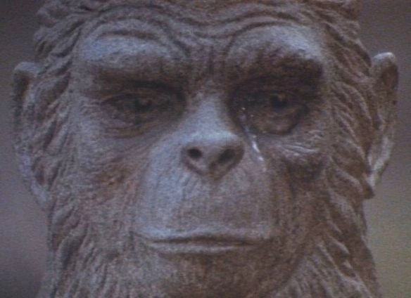 In the final script, the fight was reduced to a chimp-child cheekily pulling the hair of a human girl and, though filmed, the finished movie removed the scenes involving the bomb, making the planet's destruction look even less inevitable. However, though Paul Dehn's closing shot of a statue of Caesar shedding a tear has been interpreted by some fans as a tear of joy at the good-natured human/ape integration that his legacy has brought about, Dehn himself stated that it was to tell the audience that Caesar's efforts would ultimately fail[4].
