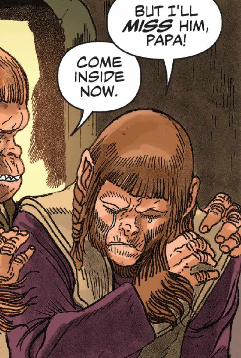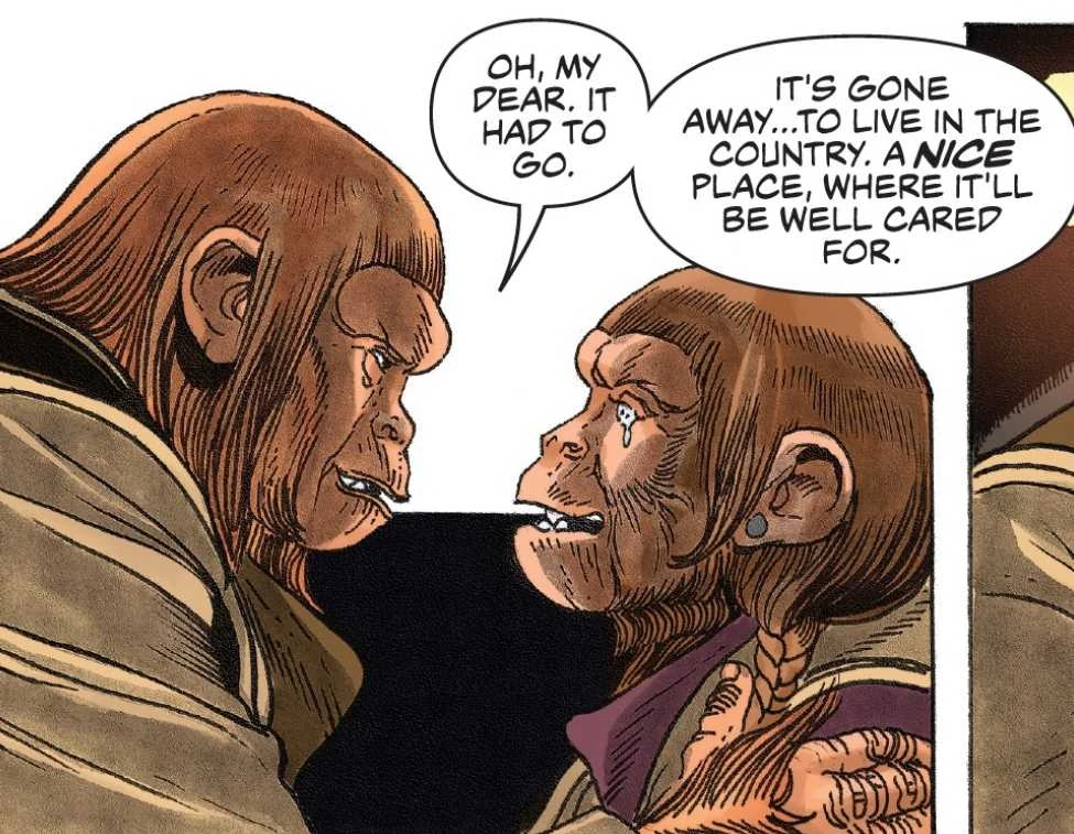 Once Elco learned about Bolo's condition, he returned home to visit him, but it was too late. Bolo had passed away the day before. Meanwhile the gorillas took Bolo´s remains in the cart for the tannery, Lucan told his son that Bolo went to live in the country, a nice place where he would be well cared for. Elco expressed how much he would miss Bolo and Lucan offered him to come inside the house.
