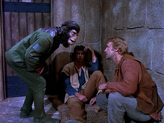 Meanwhile, General Urko secretly conspires with his soldiers to kill the humans. He instructs a guard to leave their cell door unlocked after feeding time is over, in the hopes that they may try to escape. Then he can shoot them without risking Zaius' ire. Alan and Pete soon discover that their door is unlocked, but immediately realize that it is a trap. However, they are willing to take their chances if it means freedom. As they exit the prison, a gorilla hiding in the bushes levels a pistol at them. Nearby, Galen witnesses the trap and shouts "Look out!" He dives on top of the gorilla and in the ensuing struggle, the gun goes off killing the guard. Pete and Alan run into the woods.