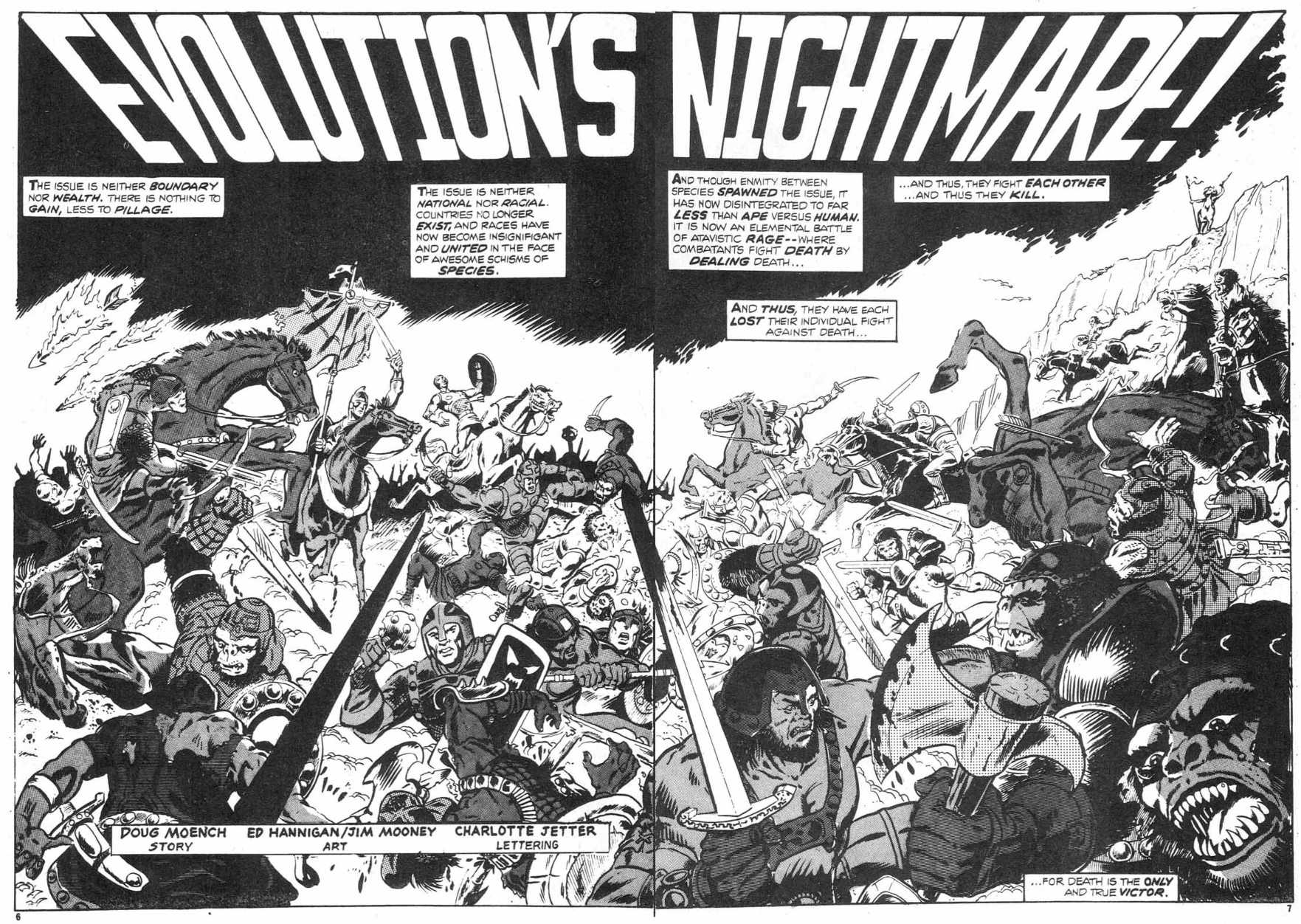 Evolution's Nightmare was a lengthy scene from the earlier days of man/ape war, written by Doug Moench and drawn by Ed Hannigan (with inking by Jim Mooney) for Marvel Comics' Planet of the Apes Magazine.[1] Moench recalled how Hannigan got the opertunity to draw an Apes story early into the magazine's run: "Ed Hannigan became a buddy of mine. I think he was in the Bullpen doing corrections and stuff. He wanted to do his own story. Back then it was easy. You just had to convince Roy [Thomas] or someone to give you a chance... I can’t remember if Mike Ploog was running late or they just decided to give him some extra time, but Ed wanted to prove he could do a story. That’s pretty much how 'Evolution’s Nightmare' came about."[2]