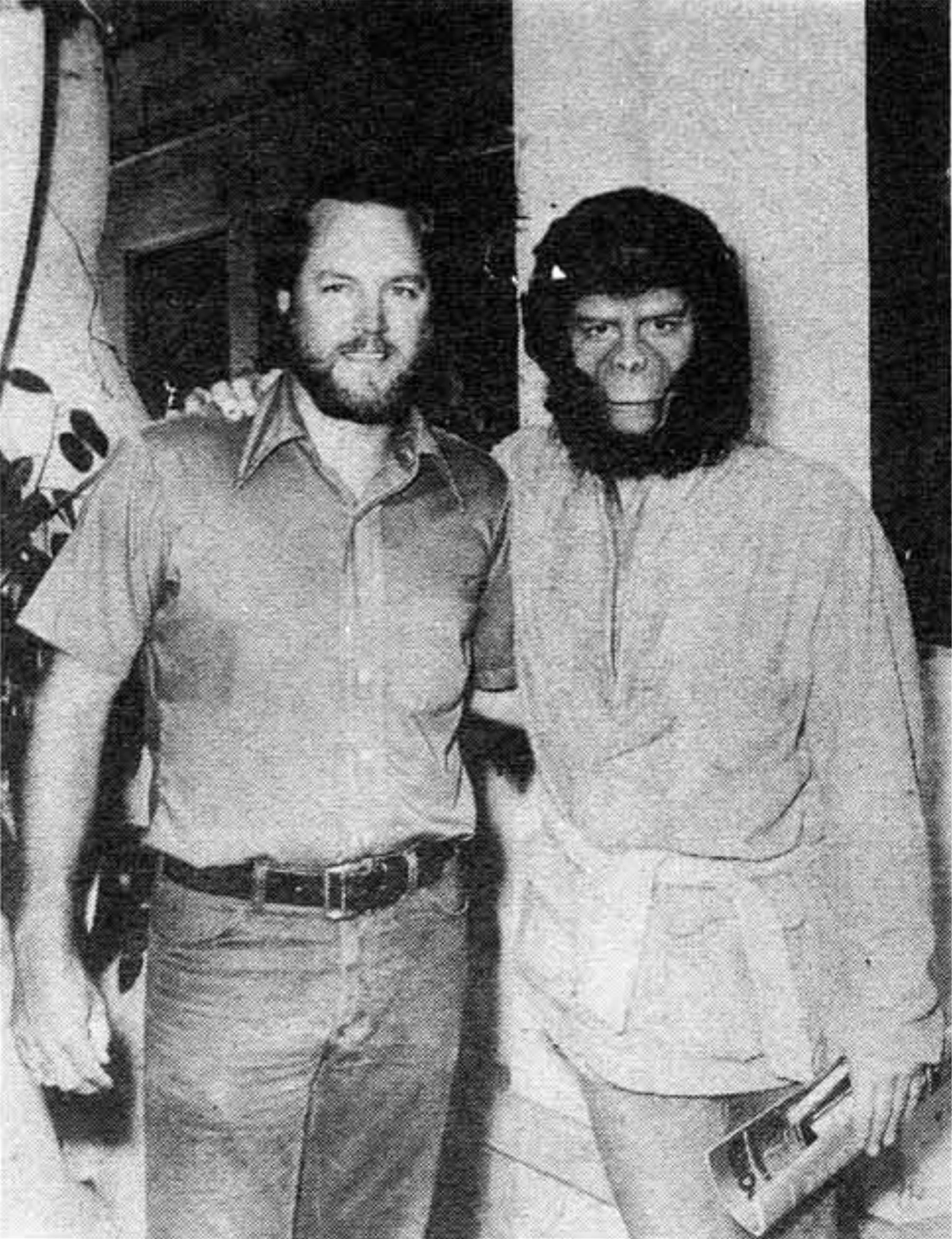 Blau then worked as a makeup artist on the Planet of the Apes TV series in 1974, where he was personally responsible for Roddy McDowall's makeup following initial training by Striepeke.[5][2] A reporter visiting the set noted that: "Dan Striepeke, one of the creators of the 'Apes' appliances, has a crew of a dozen makeup artists working under him. Their art practice is energy-draining in that it takes three full hours to apply the features. This means that if Roddy McDowall is to be on the stage, ready to work in his appliance at 8.30 a.m., he must arise at 4.00 a.m. and report to the makeup department by 5.00 a.m. Roddy McDowall whiles away the time by listening to classical music during these three hours."[6]