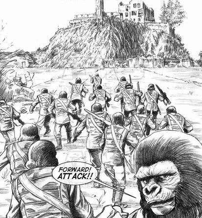In Central City, Galen's father, Yalu, tries to persuade the council to allow Galen to return to his home without penalty, as his mother is dying. Despite Urko's objections, Zaius believes that the best way to stop the trio spreading their dangerous ideas is by revealing that it was Galen's idea to leave his human companions. As Burke is taken to the human headquarters on Alcatraz, he asks his new comrades to keep Galen alive, and is surprised to hear that they have no knowledge of Virdon - he was neither killed nor captured. Urko, having assembled 500 gorilla soldiers at the edge of the city, orders an attack and the capture of Galen - alive. The humans fight hard but are driven back towards their fort headquarters.