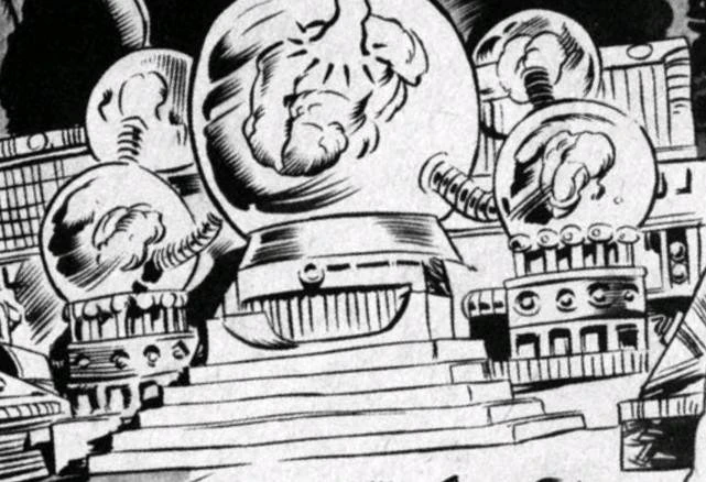 The Inheritors (self-styled) were a society originating from human experiments. They were led by the cybernetic entity known as the Supreme Gestalt Commander (or Gestalt Mind), a network of five giant brains suspended in glass chambers, named Be-One, Be-Two, Be-Three, Be-Four and Be-Five. Each telepathically controlled a division of Mutant Drones, who quickly died if their controlling mind was killed. The drones, in turn, oversaw a slave race of primitive ape-human hybrids. During a battle in the Inheritors' cave home, Jason and Alex and their allies destroyed two of the giant brains by shattering their glass casings (Be-Two and either Be-Four or Be-Five), and these were later replaced by the "newly-thawed" Be-Six and Be-Seven.[1]