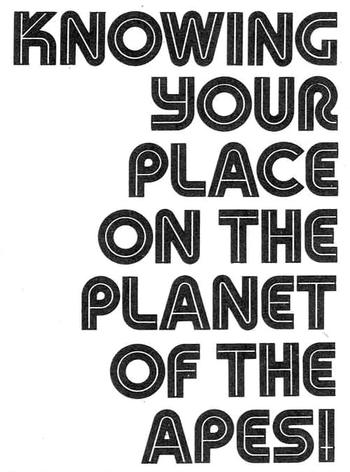 Beneath the Planet of the Apes illustrates the important transference of power from orangutan to gorilla. The Ape society, evolved to an era of militarism and brute control, replaces blissful ignorance with mindless force. Again, the progressive chimpanzees are helpless. The orangutans lead in name only, but are in reality subservient to the decisions of the aggressive gorillas, who turn to the former social leaders only for vague counselling. Beneath also introduces a new class of inhabitants into the already troublesome scene. Different from ordinary humans almost as much as they are different from the Apes, the bizarre race of mutations spawned by radioactive fallout possess powers and complexities that are extremely sophisticated and deadly. They, however, are considered merely “freaks” by the primitive gorillas who are not evolved enough to succumb to the mutant's mental attacks. As a final comment on the hopeless futility that finally destroys the world at the film's climax, it is the dim-witted, power-hungry gorillas who dominate Earth at the moment of its passing.