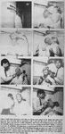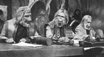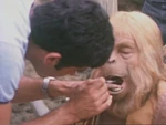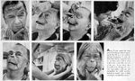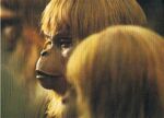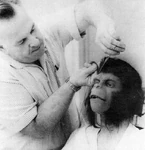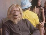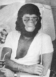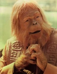 Scenes were done during dress rehearsal with Apes of all sizes and colors saying their piece while smoking pipes, cigarettes (in long holders), and cigars. Some wore glasses, aprons or any crazy-looking hat they could find lying around the prop-rooms. Gorillas played poker with men clad in rags, and chimps danced with the script girls. The most comical side of Planet of the Apes also, proved to be the most serious problem faced by the filmmakers... the make-up. Not since The Wizard Of Oz had there been a call for such odd transformations. Only three main types were required for Oz, but here there were to be four leading orangutans, three chimps, a score of gorillas and literally hundreds of extras who would also appear in make—up. The extras wore masks that slipped over their heads, topped with wigs and held closed by a substance known as velcro (the stuff on the bottom of the stewardess' shoes in 2001: A Space Odyssey). For the Apes seen in close-up throughout the film, make-up had to be specially modelled over life-masks, and applied piece by piece to the face. One of the pieces was a curved upper lip and nose, which fitted over the actor's own nose and produced the ape-like curve of the face. Only problem with this was that the performer's own nose was covered. So for the duration all Apes had to breathe through their mouths. Another curved appliance was fitted over the chin. A curved strip over the brow-ridges, a pair of over-sized ears, sideburns, beard and wig finished the job of turning human actors into Apes. Each piece of the make-up was made of latex rubber, baked after being molded from life-masks for an exact fit. The hair was composed of individual strands fitted through a thin gauze material. The webbing was then pasted to the actor's face with 'spirit gum', a rubber adhesive. After each separate piece of the make-up was fitted, the rubber ends of the pieces were smoothed into paper-thinness and glued to the face. The entire face was then treated to a coating of grease-paint. Shadows, added with grease-pencils, and special make-ups completed the final phase.[6]