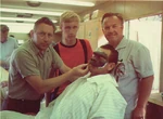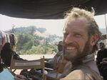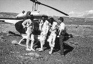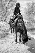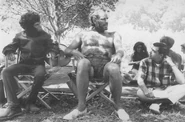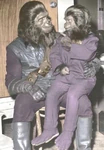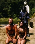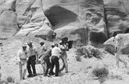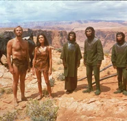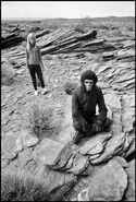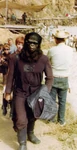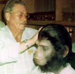 Creative Makeup Designer John Chambers noted the problems faced by the ape actors in the seering heat of the first Apes location shoot: "[Applying the makeup] wasn't uncomfortable, after they got used to it the first time, and they didn't perspire! We were up with 120* in Arizona, but there was no trouble - it was amazing! We did keep them cool, we had special refridgerated trailers for them, and we had sixty-foot makeup trailers. No one ever did this before. This is what kept them under control. We never lost one minute of production time due to makeup faults or slowdowns. I have never worked with such professional attitudes - no complaining or anything with any of the actors in any of the films. It was a challenge to them, and everyone loved it."[4] Nevertheless, on the first day of filming, shooting the desert trek in Page, Arizona, (May 21, 1967) Charlton Heston noted that "The heat is bad here. One of the other two actors playing astronauts (Jeff Burton) passed out from the heat."[5]
