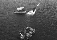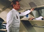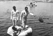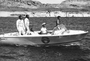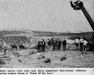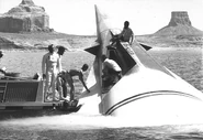 The initial plan for the movie envisaged all out-door filming taking place on the 20th Century Fox ranch property, but this proved impractical. Instead, filming was relocated to begin in Utah and later move to the ranch and the studio sound stage.[1] The scenes where the spaceship crash-lands in the lake were filmed at Lake Powell, which is formed by a dam on the Colorado River on the Utah-Arizona border.[2] The final shooting script for the movie pinpoints some of the locations that had been selected for specific scenes; the crash site was to be filmed in Lake Powell at Lone Rock; the astronauts trek was to take place on 'ochre dunes', 'black dunes', 'gray area', 'crazy canyon' and 'wire grass canyon'.[3]