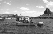 The initial plan for the movie envisaged all out-door filming taking place on the 20th Century Fox ranch property, but this proved impractical. Instead, filming was relocated to begin in Utah and later move to the ranch and the studio sound stage.[1] The scenes where the spaceship crash-lands in the lake were filmed at Lake Powell, which is formed by a dam on the Colorado River on the Utah-Arizona border.[2] The final shooting script for the movie pinpoints some of the locations that had been selected for specific scenes; the crash site was to be filmed in Lake Powell at Lone Rock; the astronauts trek was to take place on 'ochre dunes', 'black dunes', 'gray area', 'crazy canyon' and 'wire grass canyon'.[3]