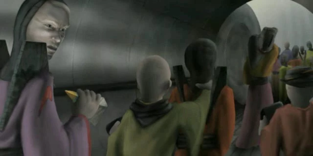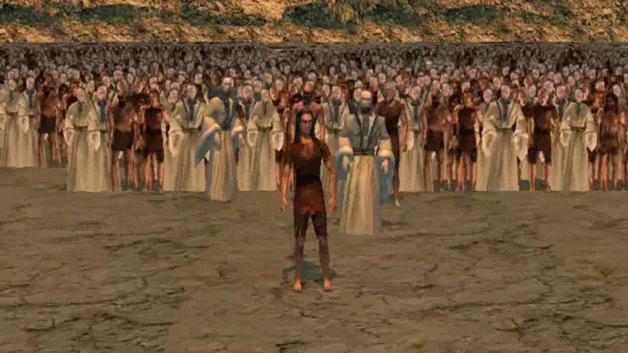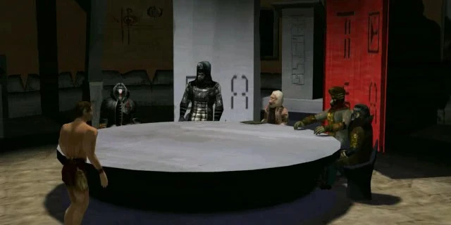 Ulysses woke in the monastery. There he found a hologram cartridge and a holographic projector. He used the cartridge he found, to listen to a really preachy holo-message - one of the last leaders of humanity bemoaning the destruction of his civilisation through war, division and the Apes. Next, he headed to the chapel, where a wall slid away and Ulysses' mission was revealed - Jonah, the human who brought the key to Ulysses' cell, explained that his appearance fulfilled a prophecy, that a man would come to rescue the human race, though another leader, Elie, wasn't so sure. Jonah revealed that he led the Human Resistance and this 'alien' planet was in fact Earth (Neterre to the resistance fighters, or Ter to the Apes). After a war had destroyed mankind, the Apes took over and the humans had split into the Ellisians and the Akanites. The rebellious Ellisians had then further split into three factions, with their leader Ellia giving each faction leader one part of an ancient relic, to be guarded and reunited at the time of renewal: a gold part was given to the group led by Ezekiel, from whom Jonah's survivors were descended, Tomas had been given a silver part and John a glass part. The tribes of Tomas and John had since been annihilated. Ulysses was given the gold part and told that John's glass part was probably at his grave in New Cyprus. A human, Gorje, was to guide Ulysses to the ruins of that ancient city.