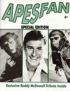 The excellently-titled Sacred Scrolls fanzine was first published in 1994, with Illinois high school student Zaki Hasan as editor and Brian Belluomini as designer, and was distributed to a subscriber base of forty or so. It featured articles, original fiction, and even comic stories by Hasan, but didn't make it past two years, mainly due to financial losses.[4] However, Hasan maintained an interest in Apes and contributed to the 2015 book The Sacred Scrolls: Comics on the Planet of the Apes. Brazilian Planet of the Apes fanzine Century City News, meanwhile, created by Luiz Saulo Adami, also included some original comic strips in it's Portuguese-language publications from 1985 onward.[2][5] One of the most highly-regarded Apes fanzines was Apesfan. Despite editors Joe Lozowsky and George R. Reis only publishing two issues (the first in 1997), the impressive quality and content set a high standard worthy of the most professional fanzines. The 60-page second issue (1999) was a 'Special Edition Tribute' to Roddy McDowall, who had recently passed away. Largely due to disappointment with the 2001 Planet of the Apes re-imagining, Lozowsky and Reis lost interest in taking Apesfan any further.