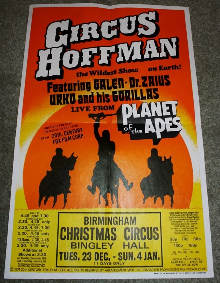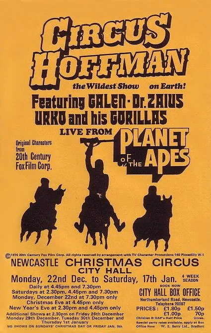 - December 22 - January 17 1976: Christmas Circus, City Hall, Newcastle ('live show' as part of the Circus Hoffman, "featuring Galen, Dr Zaius, Urko and his Gorillas"; Ian Grey worked at the Newcastle City Hall at the time as a casual showman and saw the show several times: "We had a resident Circus, starring Planet of the Apes, at the City Hall. I had no particular involvement other than turning the house-lights on and off for a few of the shows. I landed an unexpected job at the Theatre Royal in late December 1975 so I wasn't in the City Hall all that much. There were perhaps half a dozen [Apes] and they basically ran round the auditorium miming to a show tape that we put on and played through the house PA (reel to reel 1/4 inch tape, no less). From memory they were on late in the second half for about ten minutes before the Circus Finale. I don't recall a synopsis, but that doesn't mean there wasn't one. I remember the masks and costumes were very authentic. For one show, the Apes went on strike and refused to appear. The first I knew of it was the Ringmaster announcing that due to circumstances beyond their control, Planet of the Apes were unable to appear. Curious, I went backstage and found them sitting in the under-stage band room, in costume, looking miserable. They said that they hadn't been paid, they had been promised and let down too many times and they were fed up. It must have got sorted out pretty quickly as they did the next show, or possibly it was a Saturday and they did the evening one. One key thing that happened though, was that the manager's son (who was the City Hall lighting man) eloped with the high wire act - resulting in my promotion to House Electrician!" In fact, the circus didn't have a very successful season at Newcastle, and the cash-flow problems that caused the strike also led to the circus closing earlier than planned.[3])