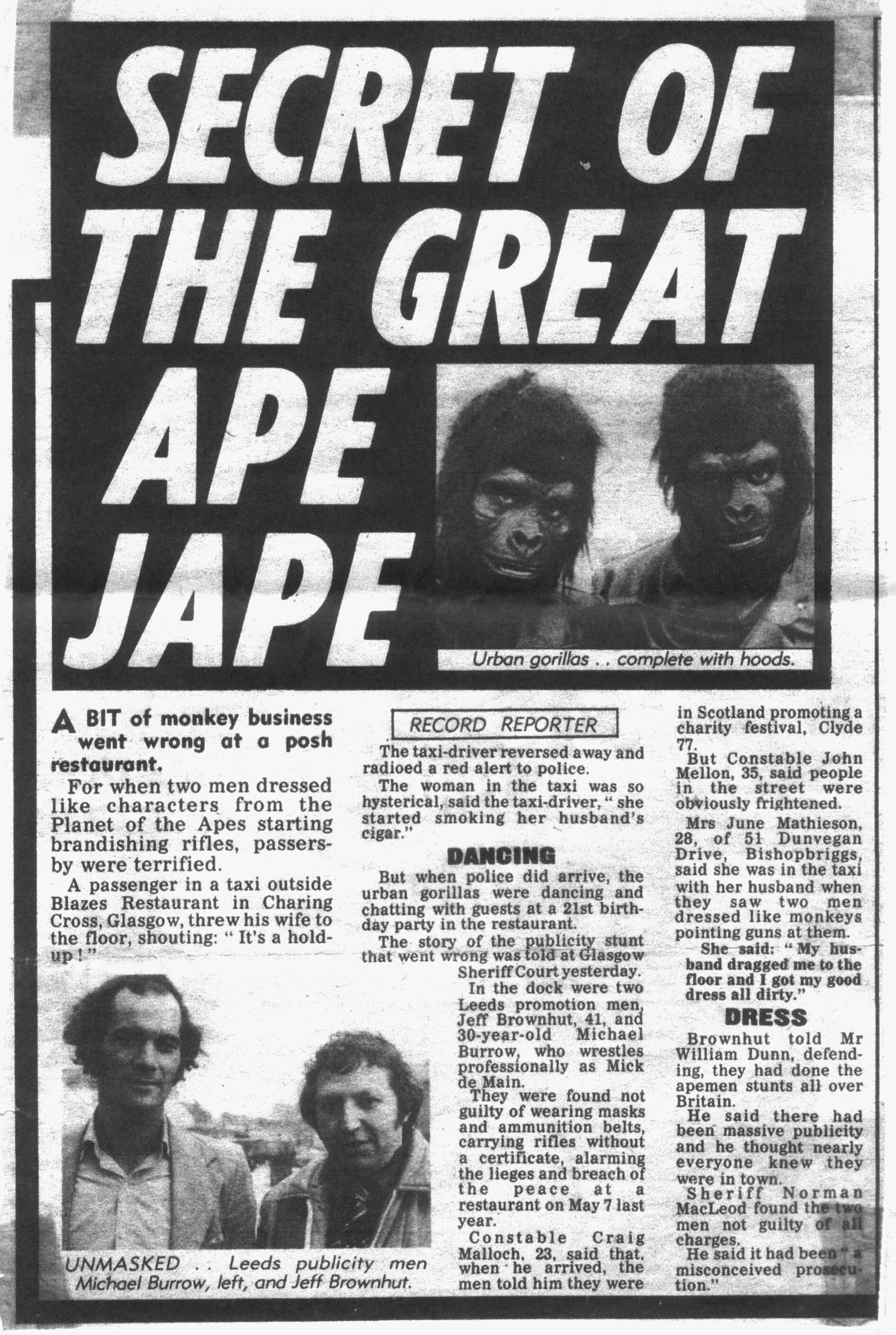 - (May 7): Glasgow (Leeds promotion men Jeff Brownhut and Michael Burrow (a.k.a. wrestler 'Mick de Main') were arrested at Blazes Restaurant in Glasgow, dressed in Planet of the Apes costumes and brandishing rifles. They were in Scotland promoting the charity festival 'Clyde 77', but passengers in a taxi outside believed a hold-up was taking place, and the taxi-driver radioed the police. A frightened Mrs June Mathieson testified: "My husband dragged me to the floor and I got my good dress all dirty", while the taxi driver added that she was so hysterical "she started smoking her husband's cigar." Police arrived at the restaurant to find the two apes dancing and chatting with guests at a 21st birthday party. At Glasgow Sheriff Court the following year, they were found not guilty of all charges - wearing masks and ammunition belts, carrying rifles without a certificate, 'alarming the lieges' and breach of the peace - with the presiding Sheriff calling it "a misconceived prosecution."[7])