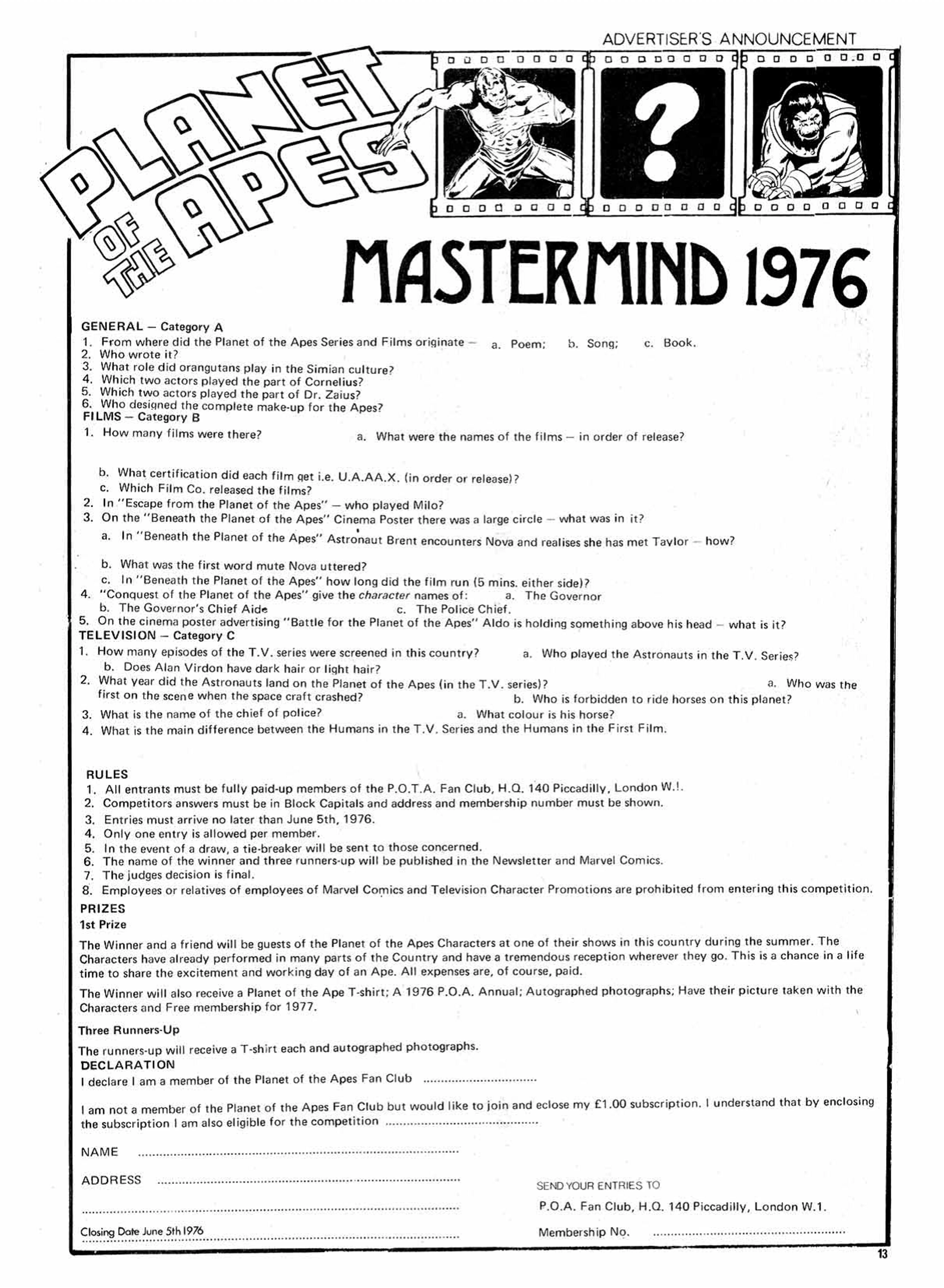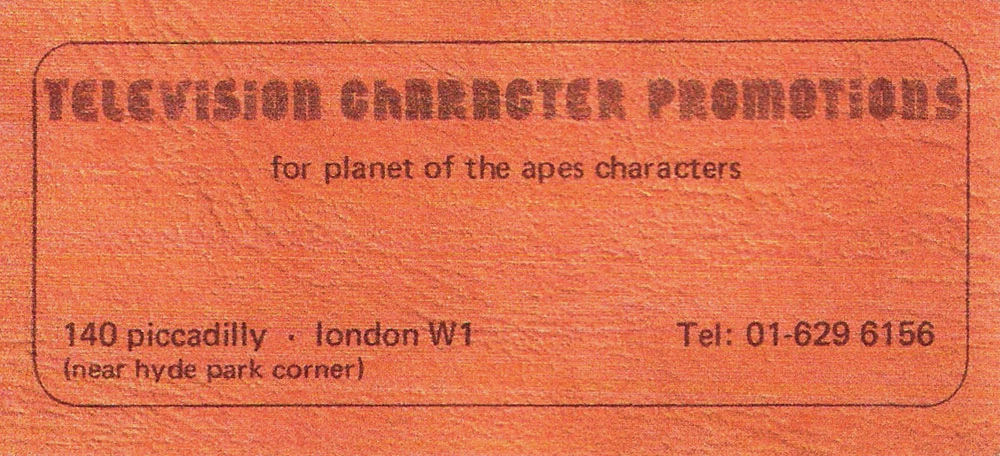 An undated letter was circulated by Television Character Promotions from their Ilford headquarters highlighting their two successful 1976 theatrical runs of six weeks each, with "two acts of four scenes" featuring "excellent sound effects, background music, fight and chase sequences, explosions and gunshots, comedy and audience participation" lasting 90 minutes with provision for extension, and advertising the company's availability for Easter and Summer dates. By March 1977 the newsletter didn't promise any further dates but said of the Tesco’s appearances: "As always they were well received and proved to be the best attraction the stores had had, the stores did their own intensive local advertising, so if you lived in the areas concerned you probably knew about it. Rumour has it that Swansea and Inverness maybe coming shortly. That’s all for now." The Fan Club then moved again, to a private address just outside Braintree, whilst the promotional operation moved north, as Peter Caulfield explained: "'Big' Mike is moving the 'Planet Of The Apes' offices up to Leeds, where he has just bought a new house. Unfortunately, I am not in a position to move there as well, so I shall continue to operate the club from my own office. No more correspondence whatsoever should be sent to the office in Ilford. OK?" Marvel had already stopped publicising the Fan Club by the time the Apes were dropped from its Mighty World of Marvel comic in June 1977.