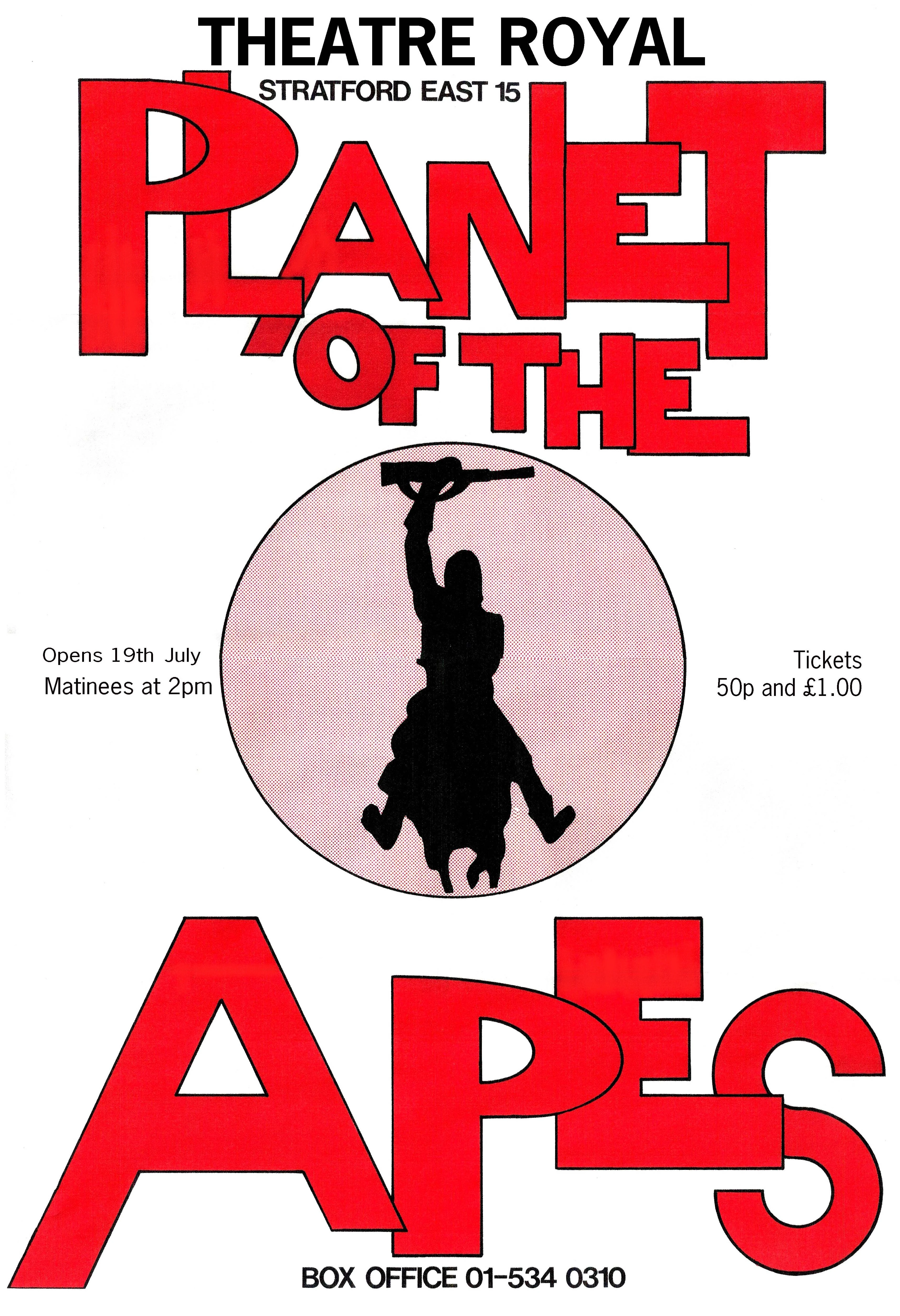 Cast-members Nigel Jones (as Urko?), John Mundy and Geoff Freshwater were seen in costume on the London Underground in a publicity shoot for the Stratford show. Matinees were at 2pm and tickets were 50p and £1.00. Fan Martin Gainsford was one of the children lucky enough to witness the Apes live show: "My older cousin appeared one Saturday and flashed a grin 'Ready Martin?' 'For what?', I asked. 'The Planet Of The Apes stage play' he replied. My head was spinning as a week or so earlier I had seen a photograph in the paper of some gorillas on a tube train with a small article about a play that was being staged. It was in a part of London I had never even heard of. After what seemed an eternity of buses and tube trains we ended up in East London and at a theatre packed with kids like me. The whole thing was a little bit hokey even for me as a kid and quite like a pantomime with audience interaction and loads of shouting from the kids and stuff but it was still an amazing experience and one I will cherish forever." Similarly, the show made a lasting impression on Lance Alexander: "I went to see the show in about 1976, I was living in Thurrock, Essex at the time. Really not sure which theatre I went to but I do remember the Ape soldier jumping off the stage and running up the gangway waving his rifle around. He then decided to pick on me, as I was on the end row, and started asking if I was hiding the humans? He tried to look under my seat and was going back to get his net.....for me! Needless to say at the age of 5 I was slightly concerned! ...After the show the guard that 'attacked me' felt so bad for making my bottom lip wobble he had his photo taken with us." "I also remember the bit when the space craft crashed at the start of the play - smoke, flashing lights and the astronauts in upright cylinders... I have always enjoyed thinking back to those days and it was one of the reasons that part of my work now is designing Ape and Chimp themed art pieces."