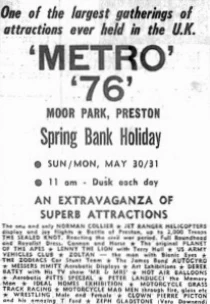 - May 30, 31: Moor Park, Preston (billed as 'tour', "80,000 people watched the arena show" in Preston as part of Metro '76 - “one of the largest gatherings of attractions ever held in the UK” over the Spring Bank Holiday weekend, culminating with a re-enactment of the English Civil War-era Battle of Preston. The Lancashire Evening Post predicted, "The original cast from Planet of the Apes will stage a full show on the park with soundtrack – but only the gorillas will be allowed to ride the horses!"[5] Entrance fees for the event were 80p for adults and 40p for juveniles, starting at 11am and running until dusk. One attendee adds, "I can't really remember much of the detail as I was very young. I do remember a lot of running about and the apes on horses. I remember being very impressed with it at the time".)