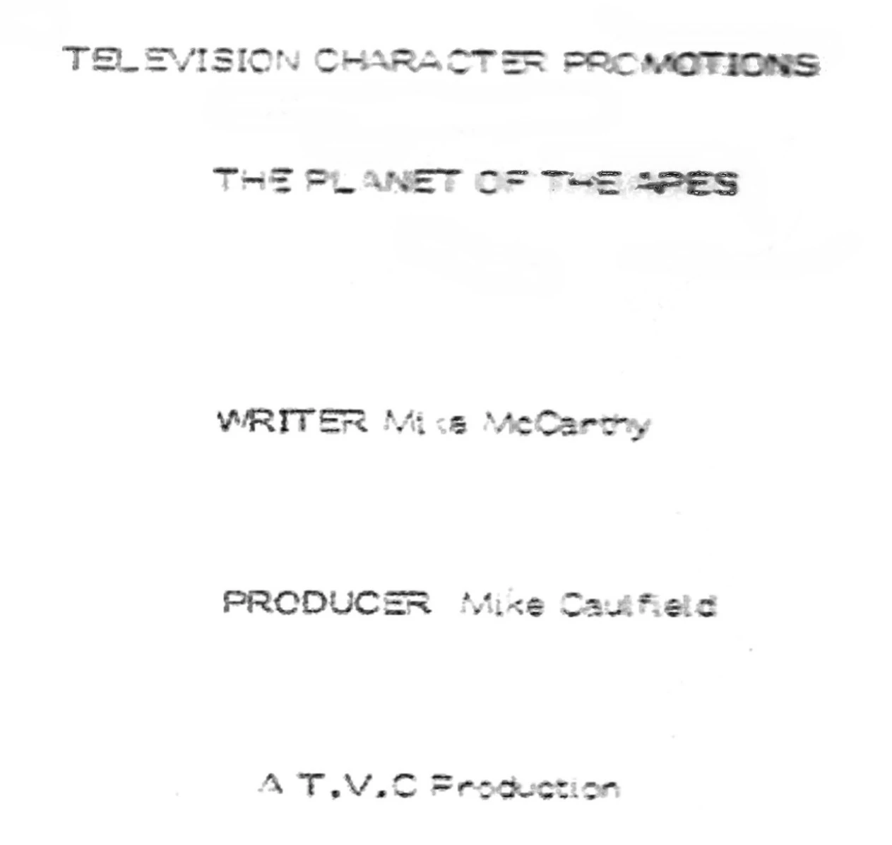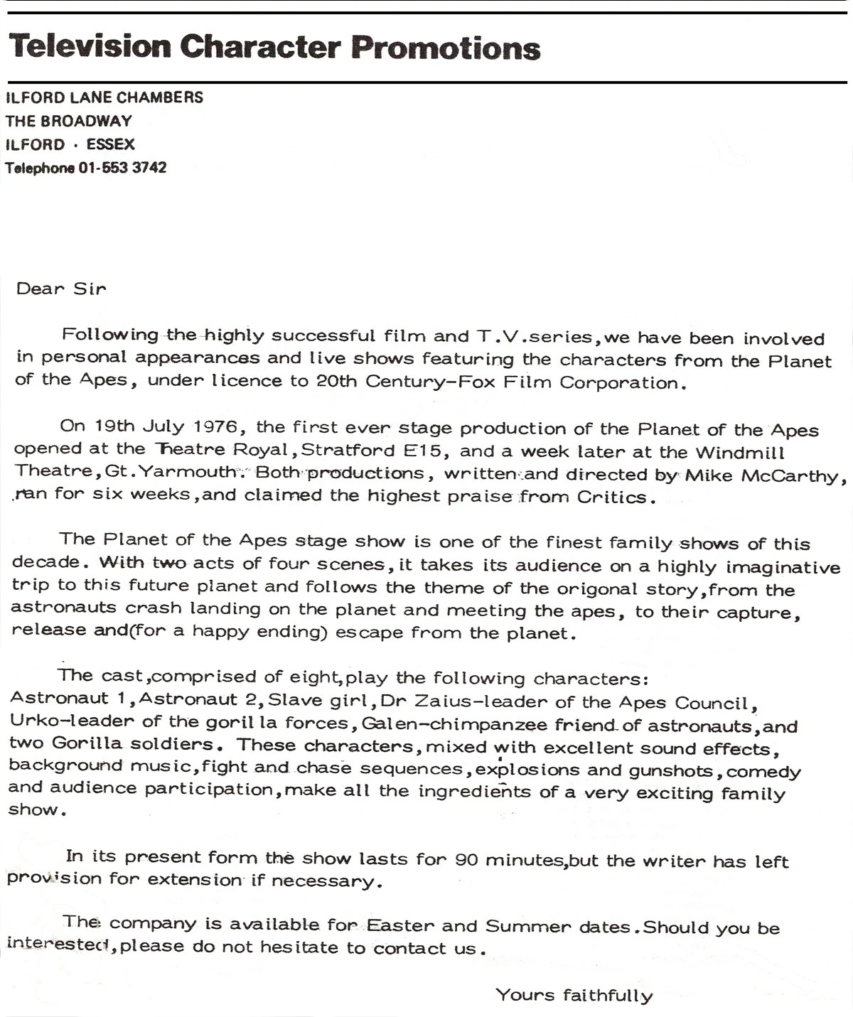 While the arena shows were at their height, Television Character Promotions ambitiously decided to add another string to their bow, as the May 1976 newsletter proudly announced the forthcoming Planet of the Apes stage play: "At last, the highly successful "Planet of the Apes" comes to the stage. Action, Drama and Excitement. Fun for all the family. 19th July for five weeks. Book now." This original Planet of the Apes theatre script was penned by Fight Director Mike McCarthy, mixing elements of Pierre Boulle's novel, the films, the TV series and an earlier script idea by producer Mike Caulfield. In 2010, Mike McCarthy supplied copies of both the theatre script and a synopsis of the arena show to the Hasslein Books website, where the originals are reproduced along with text transcripts.