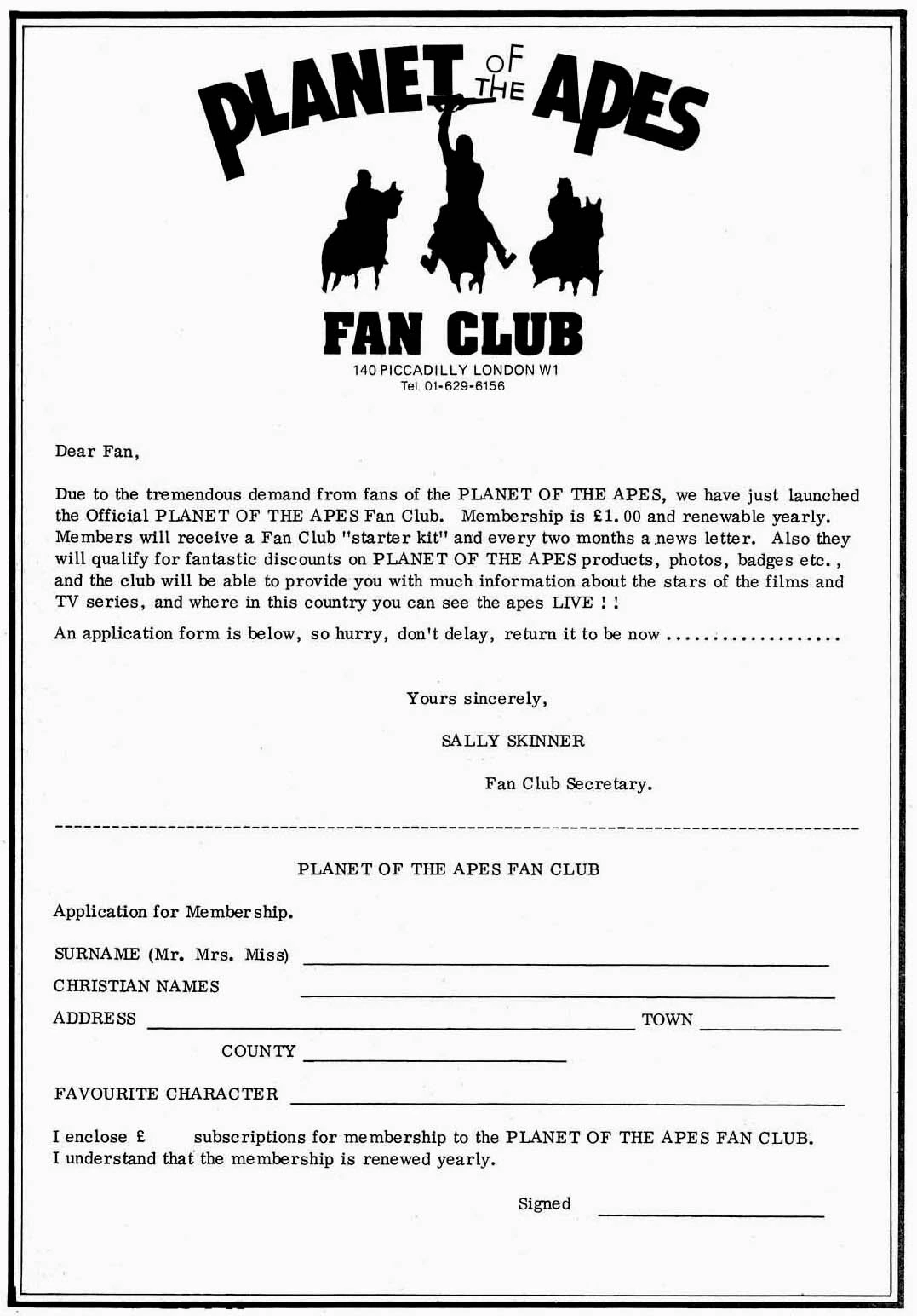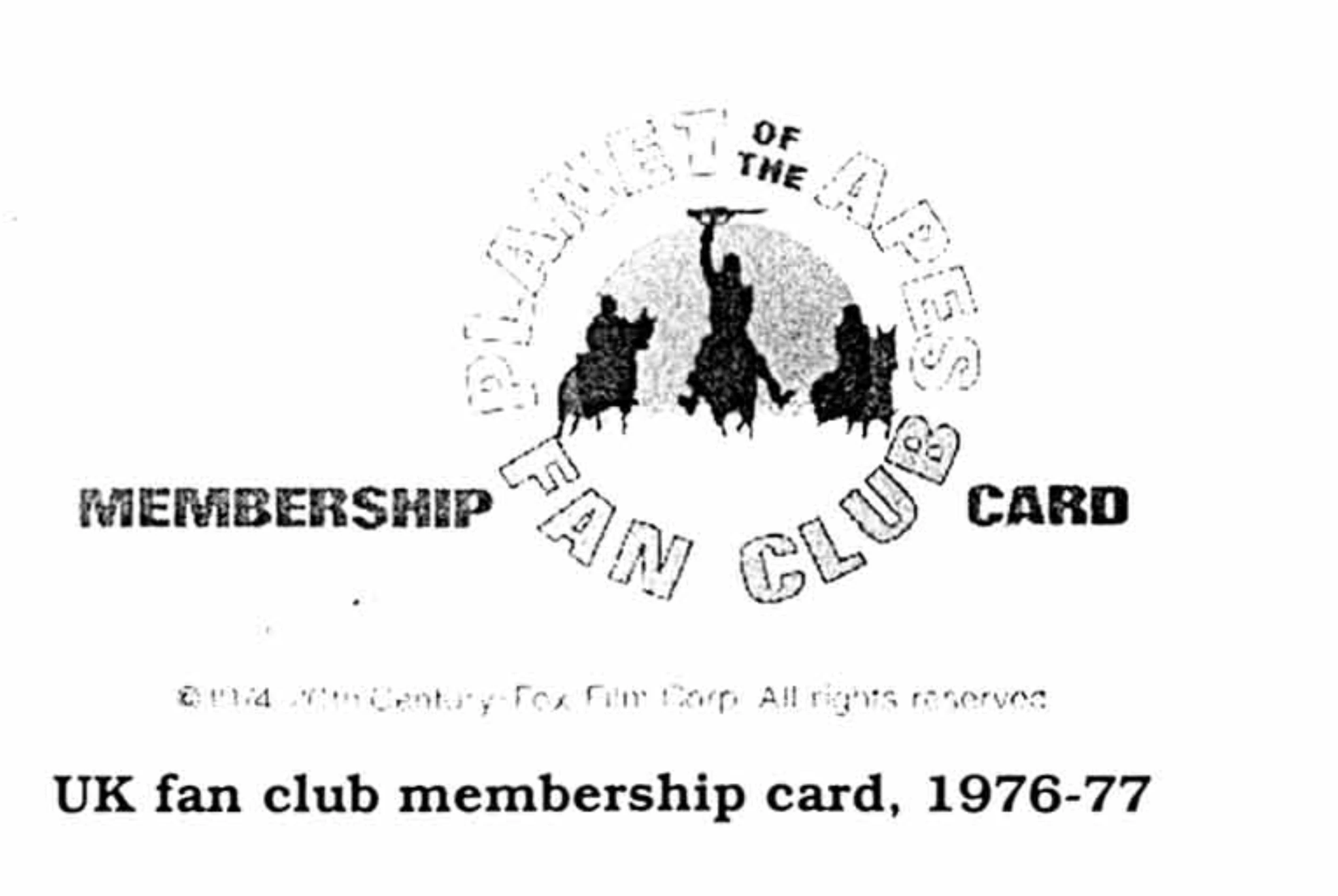 Backed by full-page ads in the Marvel Apes comic, the Fan Club was claiming membership of 1200 by May 1976, from as far away as Brazil and Canada. Fans sending in their £1 annual subscription received an Apes Starter Pack – a selection of pens, car stickers, badges and prints – and the promise of a bi-monthly newsletter. Club member Martin Gainsford remembered: "I was a full-on Sci-Fi/Monster and comic book nut so when the POTA TV show was announced I was very excited. I bought the comic every week from Marvel and of course the gum cards. I begged for the Mego dolls for Christmas and Birthdays for a few years as well as the annuals at Christmas. I joined the fan club too and it was then that things took a new turn for me. The membership package included three badges along with a couple of almost A3-size heavy card pictures. One was the same as the 'Virdon and Burke' badge and one had the standard publicity shot of Galen. I think there may have been a pen but certainly a card and also a vinyl sticker. My dad went mental once as I ran up a huge phone bill during a school holiday talking to the guys at the club office."