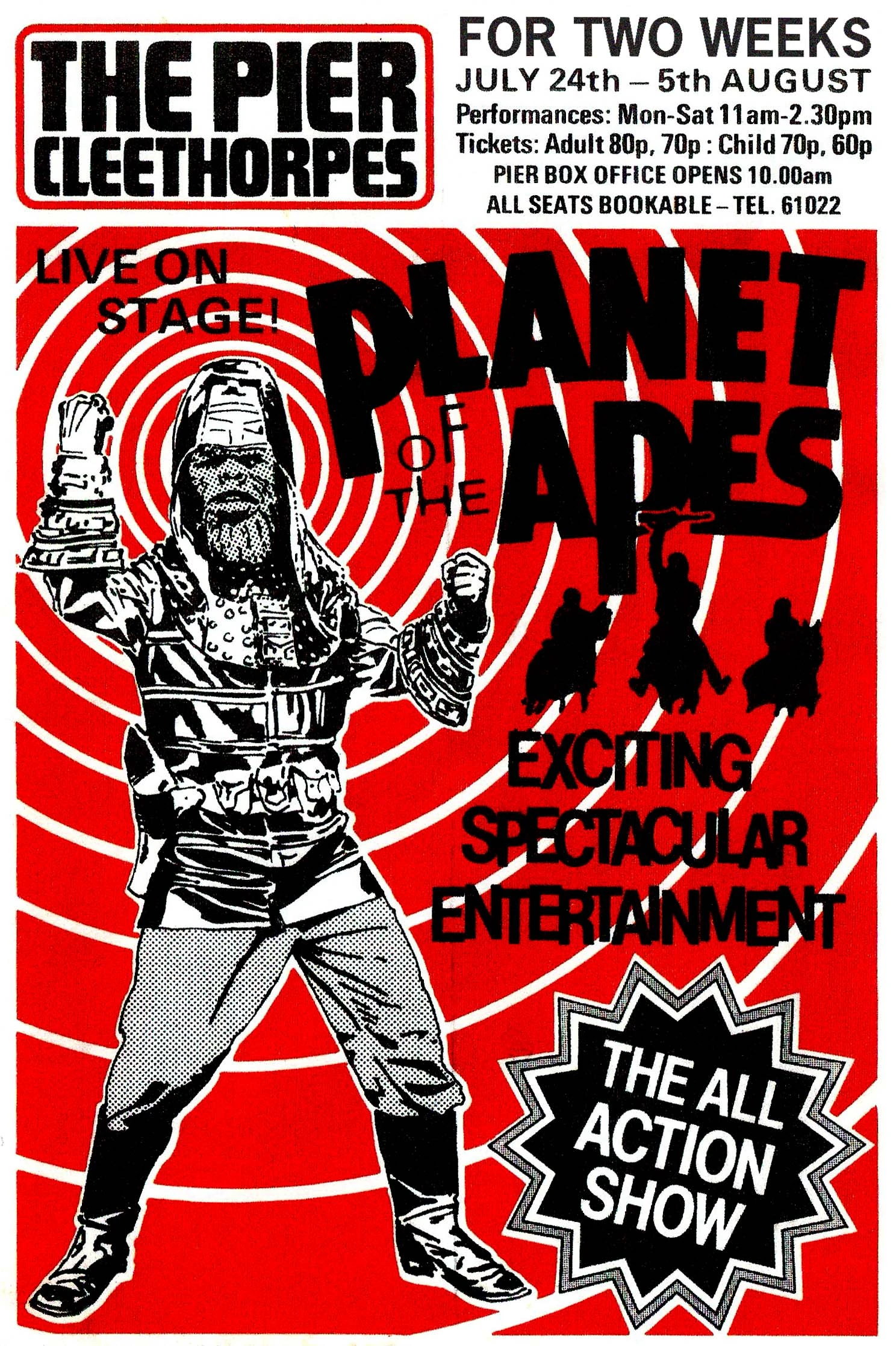 Although it seems that the plans for a Christmas run at the Kilburn Empire or a tour of Ireland never came to fruition, Mike McCarthy was invited back to direct the revived stage show for a two week run during the summer season at the Pier Pavilion Theatre in Cleethorpes, Lincolnshire in 1978. The show ran from 24th July to 5th August with performances Monday-Saturday 11am and 2.30pm, and tickets were 80p, 70p per adult and 70p, 60p per child. Although the cast is unknown at present, a newspaper article and photo survives, listing astronauts Bob and Geoff (Jeff?), Pela, Galen, Urko, Doctor Zaius and gorilla guards Zako and Orak. The article maintained that this was "the first time that the Planet of the Apes show has been enacted on stage", with Mike McCarthy adding "The Planet of the Apes events went down really well in Cleethorpes in the last two years, so it was a natural progression that we should come here to stage our first ever show. We are hoping to tour the country with it." In a reminder of earlier events, some fighting had to be cut from the final scene of the performance witnessed by the news reporter when a gorilla was rushed to hospital with a suspected broken nose. Actor Robert Angell was apparently among the performers at Cleethorpes.[10] Television Character Promotions seems to have disappeared off the radar after August 1978, taking the UK’s only official Planet of the Apes Fan Club with it.