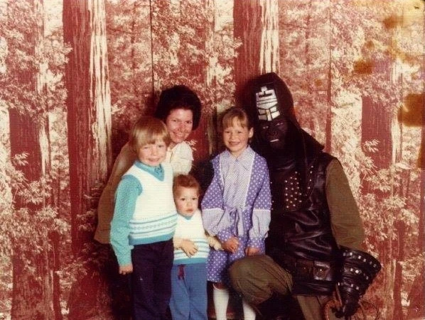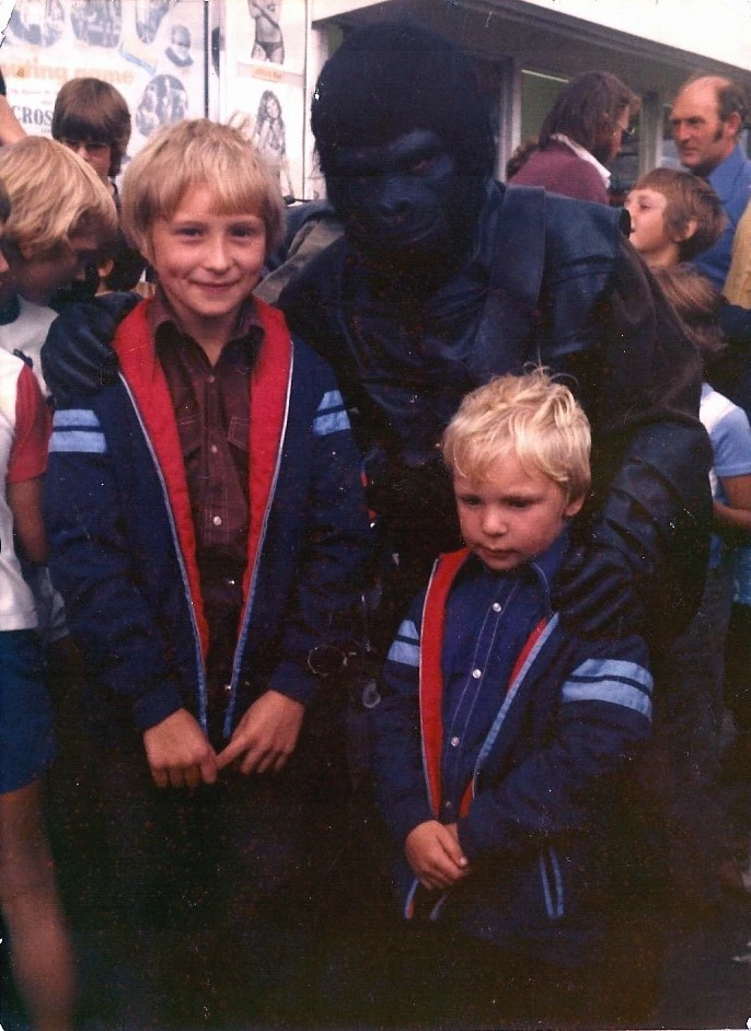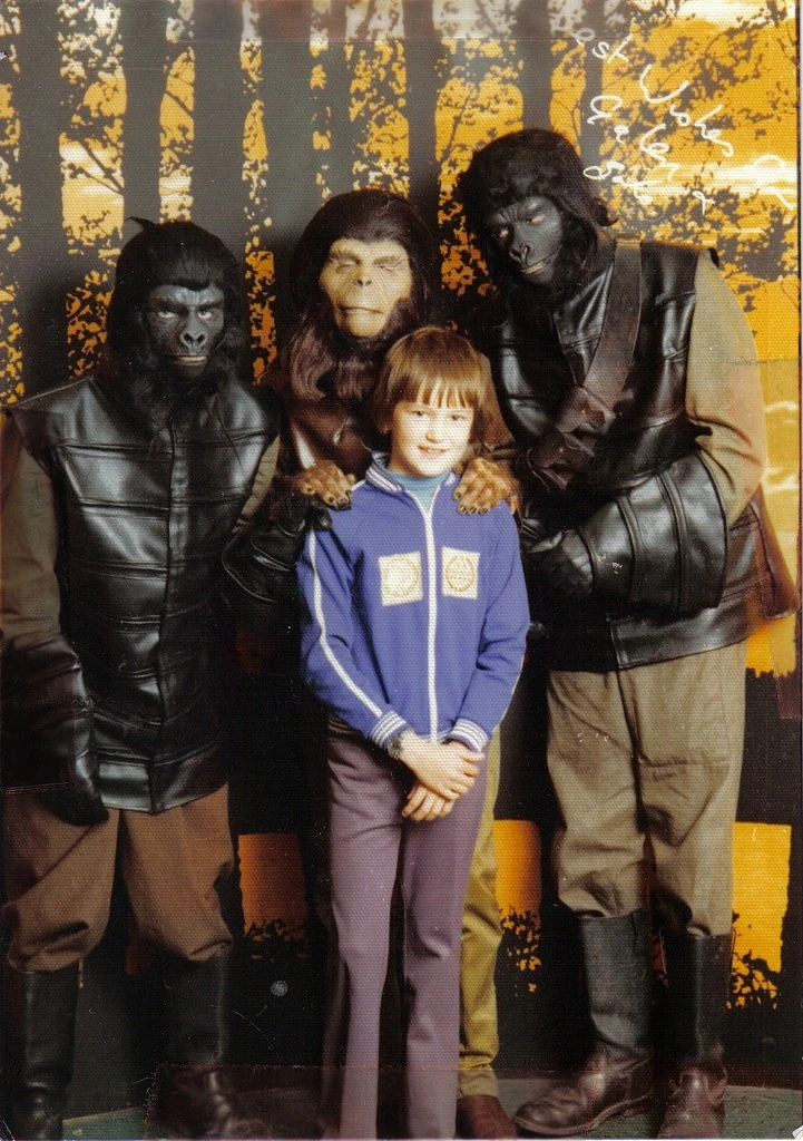 Picture with a stage show gorilla. (Photo courtesy of Lance Alexander, "the small one, unimpressed at the time.")