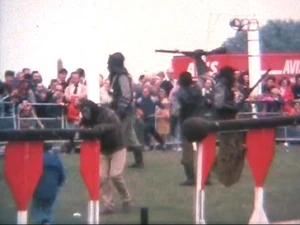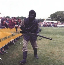The highlight of the newsletters was always the reports of Ape appearances ‘in the flesh’. Television Character Promotions provided live Ape events of two types: (1) personal appearances by a couple of costumed characters, who would pose for photographs with fans and offer ape autographs, generally at supermarkets and shopping centres; and (2) a set-piece live show performed by a full cast. From advertisements in Marvel's UK comic, it appears the live shows were already being staged as early as July 1975. These shows from 1975 and early 1976 were usually part of a larger entertainment package at circuses, festivals and rodeos. After Mike McCarthy was hired, the outdoor arena shows he directed had an action sequence involving two astronauts, Galen, Urko, Dr. Zaius and gorilla guards Virgil, Plato and Nero, usually with horses and a lot of stunts but no actual script.[1] A 'live synopsis' distributed to audiences at the live shows, introduced newcomers to the world of the Apes, and pledged: "Today you are seeing the first live show presentation of the Planet of the Apes. You are seeing authentic characters who will enact a specially prepared show with live action and an original soundtrack." A pre-recorded tape narrated the show with a voice-over and music. The astronauts were chased by the gorillas into the audience, captured, and tied up to face a firing squad. Galen then freed them before he too was chased into the crowd and caught. Then the astronauts fought the gorillas and set Galen free, but were again captured and put before a firing squad. Finally, Galen placed a bomb by the ape guards and all escaped, leaving Urko and his apes to be booed off.[2] Mike Caulfield, with his imposing physique, often took on the role of Urko, but there was quite a bit of character rotation amongst the actors on the arena shows. Caulfield also acquired the costumes - consisting of green army denims, a black leather jerkin and jack-boots - which were then modified to a very authentic standard by his wife June. The pull-over rubber masks (possibly from a Fox-licensed Hollywood company such as Don Post Studios) were very tight-fitting and covered the entire head and neck, and black stage make-up was applied under the eye socket to blend the flesh with the mask. The guns were Lee Enfield .303 rifles converted to fire blanks.[3][1] Right from the start these live shows attracted considerable interest.
