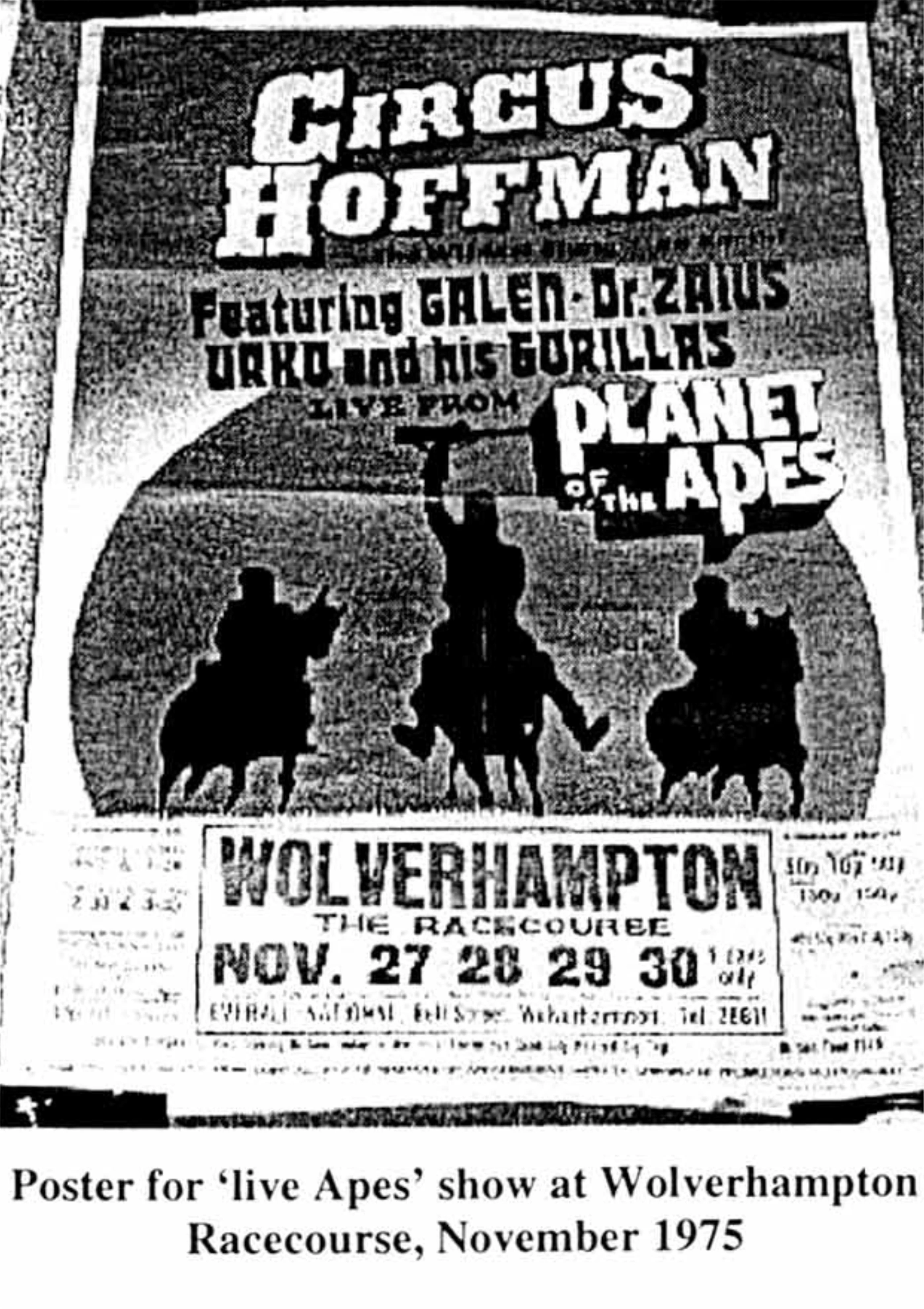 - November 24, 25, 26: Wollaston Recreation Ground, Stourbridge ('live show' as part of the Circus Hoffman, "featuring Galen, Dr Zaius, Urko and his Gorillas"; Andrew Shakespeare - club member 478 and 'ace reporter of the month' - wrote a review of this show which was printed in the May 1976 newsletter: "Inside the tent there was a Planet of the Apes stall where I bought a colour picture of Dr. Zaius and one of Urko, a black and white one of Galen and a Dr. Zaius badge. There was an interval during the performance and in it one could have their photograph taken with Galen. After the interval the Apes came into the ring, then the astronauts, then Dr. Zaius and Urko. When the audience saw the gorillas and their leader they started booing, then gave a cheer as the renegade ape, Galen , hopped into the ring. The gorillas caught the astronauts and put them in a cage then started chasing Galen, firing their guns at him. Galen climbed on one of the poles and then, when he came down again, was chased through the audience. A gorilla rushed up to where I was sitting and fired his rifle. It gave out a terrific 'BANG'. Galen escaped the gorillas and jumped back into the ring, where he knocked down Dr Zaius. Quickly he released the astronauts as Urko rode up. An astronaut pulled him off his horse and they started fighting. Soon Urko was lying flat on the ground and Galen rode off with the astronauts leaving Dr Zaius, Urko and the gorillas either tired or knocked out. At the end of the performance the Apes gave their autographs. I have got Galen's five times, Urko's four times, Zaius' once and another gorilla's (Virgil) three times. I had a lovely time and it was very enjoyable.")