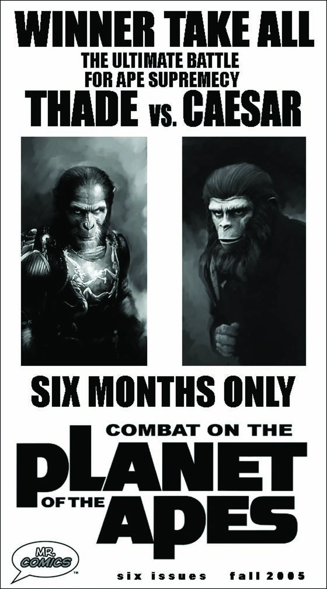 Pace created a promotional poster, cover art, and several interior pages for the Thade-Caesar storyline. Although Fox initially approved the concept, they later changed their stance and decided to scrap the idea altogether. In response, Ty Templeton significantly altered the story to focus on Aldo instead of Thade. "When we moved to a new storyline," Templeton explained, "Richard was too busy to work on the book, and we, sadly, had to go with other creators." Pace's artwork was later intended to feature in a trade paperback compilation of the final miniseries[1], but the release was ultimately canceled due to financial issues faced by MR. Comics.[2]
