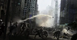 The apes then use a trolley to head for their next target, the Golden Gate Bridge. They planned to cross the bridge to get to the Muir Woods Park redwoods, but are forced to battle a police blockade on the bridge. Caesar, realizing something is up, stops his army and launches a three-pronged plan. Most of the chimpanzees, guided by Koba, bypass the blockage by traversing the bridge's high-wire supports. The orangutans and some of the chimpanzees led by Maurice bypass the blockage by traveling along the bottom supports. The gorillas and several other chimps, headed by Caesar, Buck and Rocket confront the blockage directly, going straight across the bridge. Caesar has the gorillas push a bus in front of the police bullets and then steal a police horse. Caesar orders his army to attack, resulting a fierce battle. Despite their advanced weapons, the police are defeated by the apes. However, Jacobs arrives in a helicopter and Police Chief John Hamil who begins gunning down a few of the apes before setting sights on Caesar. Buck sacrifices himself to save Caesar by jumping into the helicopter and attacking the pilot. This causes the helicopter to crash onto the bridge, killing everyone except for Jacobs, who is trapped beneath the wreckage. Koba seizes his chance for revenge and sends Jacobs falling to his death into the bay below. Most of the apes survive the battle, and escape into the Muir Woods Park redwood forest.
