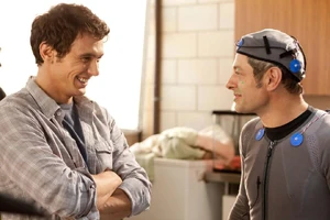 Rupert Wyatt suggested, "We’ve always referenced 'Close Encounters' as the sort of film that this should be, and if you look at the actors in a film like that, they’re fundamentally character actors, playing leading roles. If you look at Richard Dreyfus, his career is so broad in terms of what he’s done and what he’s achieved but the bedrock of his career is that he’s a terrific character as well as a leading man, and I think that was always our approach."[1] "The other Apes films dealt with talking apes and apes that were humanoid in many ways. This film isn't about that. It's about apes as apes... We had a choice of using either live apes or CGI. Personally, I had moral problems with the idea of using chimps. And from a practical point of view it would be virtually impossible to get them to do what we need them to do within our schedule."[17] Rick Jaffa agreed: "We knew it ultimately wouldn’t be up to us, but we never thought in a million years they’d use real apes. Because in many ways, it’s an animal rights story. You’re not going to be able to get around that issue - the treatment of the animals."[1] In fact, it was reported that Wyatt wanted to send a message to other studios that in this day of advanced computer animation, there’s no need to stress out real animals for film-making, and that Fox Studios was working with The Dian Fossey Gorilla Fund to draw awareness to animal experimentation in labs around the world.[18] Andy Serkis agreed, claiming that it represented a massive improvement on the 1968 movie: "As much as [the original films] are loved, I don't think you could have got away in this day and age with doing the coconut-shell mouths. You couldn't have done it any other way than performance capture." James Franco had a similar attitude: "I actually haven’t seen all of the Apes movies. I saw the first one a long time ago and then I watched it again and I watched a documentary about the making of all of them. And I guess back in the day they spent a ton of money, at the time what was a ton of money, on makeup and effects. Now I assume the original Apes movie has kind of a cult appeal but you look at the masks and you say, ‘Well... I can’t believe they are having serious philosophical conversations and they’re wearing those crazy masks’. But reality, or the idea of apes talking, has moved forward."[19] "In the later movies it becomes about race and social upheaval, so the movies were kind of comments on current issues. The older movies can get away with that with their cult value. 'Rise of the Planet of the Apes' is not a bunch of apes sitting around having philosophical discussions." "I don’t feel the same way about 'Rise of the Planet of the Apes' as I do about '127 Hours' or 'Milk'. It was a different kind of acting... I never thought of this movie as an example of my creativity. I was an actor for hire... It sounds to me the final movie will be different from the screenplay, which had a lot of character development. The movie seems to be more action now. I went and did my job, and I’m supposed to be a scientist. I feel pretty confident that I did that."[20]