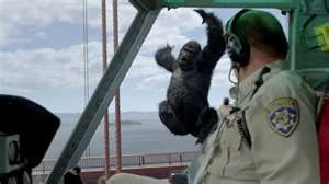 The apes then use a trolley to head for their next target, the Golden Gate Bridge. They planned to cross the bridge to get to Muir Woods, but are forced to battle a police blockade on the bridge. Caesar, realizing something is up, stops his army and launches a three-pronged plan. Most of the chimpanzees, guided by Koba, bypass the blockage by traversing the bridge's high-wire supports. The orangutans and some of the chimpanzees led by Maurice bypass the blockade by traveling along the bottom supports. The gorillas and several other chimpanzees, headed by Caesar, Buck and Rocket confront the blockage directly, going straight across the bridge. Caesar has the gorillas push a bus in front of the police bullets and steals a police horse. Caesar orders his army to attack, resulting a fierce battle. Despite their advanced weapons, the police are defeated by the apes. However, Jacobs arrives in a helicopter and police chief John Hamil begins gunning down the apes before setting sights on Caesar. Buck sacrifices himself to save Caesar by jumping into the helicopter. This causes the helicopter to crash onto the bridge, killing everyone except for Jacobs, who is trapped in the wreckage. Koba seizes his chance for revenge and sends Jacobs falling to his death into the bay below. Most of the apes survive the battle and escape into Muir Woods.