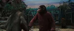 At the primate facility, Caesar starts out being treated poorly by both Dodge and the other apes, particularly the dominant chimp, Rocket. Despite this, Caesar manages to form a friendship with Maurice, a former circus orangutan who also knew sign language. Later, Dodge brings some visitors to the facility. Without caution, the male visitor moves too close to Caesar's cage and is grabbed by Caesar, having his pocket knife unknowingly stolen. Later, Caesar ties the pocket knife to a stick and uses it to unlock the door and free himself. He goes into the play den where he frees Buck, a large male gorilla, gaining his respect and friendship. Caesar, with Buck at his side, lures Rocket into the exercise area where he hits Rocket over the head with a metal gasoline canister but does no more harm, establishing his dominance over the apes in the facility. Later Caesar steals cookies from Dodge and gives them to Rocket. Though tempted to eat them all, he instead, gives them to the other apes. Caesar gains the respect and companionship of Rocket and the other apes. Later, Caesar tells Maurice his reason for making Rocket share: "Apes alone, weak. Apes together, Strong!" However, pointing to several apes behaving foolishly, Maurice states "Apes stupid" which unknowingly gives Caesar an idea.