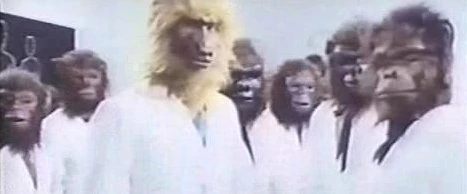 The next scene then shows the three of them laying on beds in the lab. They wake up and start exploring the seemingly empty building. Johnny steps into a room full of apes, all in lab coats. They have awoken in another time populated by a militaristic ape society, the outward appearance of which is similar to 20th century earth; the apes drive 20th century vehicles and fire M-16s and hunting rifles. It is suggested that they evolved by imitation. Police Chief Gebar arrives to inspect the prisoners. Gebar establishes his authority by pointing at the prisoners with his 'laser whip'. Gebar orders the humans to be taken to some sort of quarry where they are tied to a post for execution. Johnny, Catherine, and Caroline then escape from the apes. Eventually they see a house in the distance. Thinking that they have finally found safe refuge, they run over to the house and go inside. Pepe, an ape-girl, lives in the house along with her mother, but is curious about the humans and befriends them, but the local apes approach the house, waving pitchforks and other tools, intent upon killing the 'naked apes'. Catherine and the others run off into a field. The humans are about to be captured when suddenly the apes halt their pursuit and begin pointing to stone totems standing at the forest's edge. This is a booby-trap laden jungle area Forbidden Zone known as 'Green Mountain', taboo to the apes.
