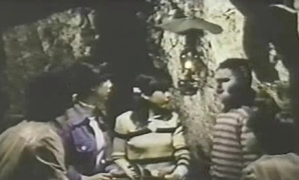 At police headquarters, the District Leader commands Gebar to find the humans. Gebar commands his ape police to move into Green Mountain and find them. A human in hiding, Godo, helps them escape from the apes. A hermit, Godo knows little about his own background or other humans in the world, but is well-known to the apes as a fearsome warrior. He takes them to his home in the caves of Green Mountain. Gebar and his squad of apes have crossed the barb-wire fence and are setting off booby-traps. Pepe has come to help, she is running through the fields and into Green Mountain in order to make contact with the humans. Meanwhile, a UFO appears overhead. It turns out that Godo is also friends with Pepe. Pepe informs Godo that Gebar has set fire to Green Mountain, apes appear and take the humans prisoner again. Back at the quarry, we see that Godo has been tied to a stake while an ape 'witch doctor' is pounding on bongo drums. Gebar orders the soldiers to present arms. Just as it looks like it's the end for Godo, the Commander and the District Leader arrive in a car and approach Gebar. The District Leader tries to explain to the Commander that Gebar has ordered the execution without approval, and the Commander orders Godo to be released. He orders the humans to be taken to his headquarters in the ape city. The Commander protects the humans and wants to integrate them into ape society.