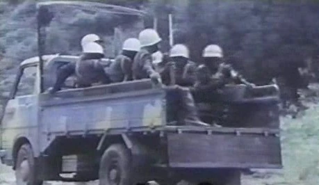 After Godo has brought Pepe back home to her mother, Godo and the others drive along a dirt road back to Green Mountain in order to find EUCOM. Catherine notices Gebar's jeep parked off to the side and Gebar suddenly leaps out and explains that he has come alone to deal with Godo once and for all and can now finally avenge the death of his wife and son. The UFO appears overhead once again and jams Gebar's gun. Gebar charges the UFO, which has now landed at the cliff top, demanding to know why they won't allow him to kill the man who murdered his wife and son. Suddenly a panel opens on the UFO showing footage of the events which lead to the death of Gebar's family. As Gebar watches in stunned silence, we see Gebar's wife and son clinging to a vine, hanging over a cliff. Now the screen shows Godo running to the cliff's edge and pulling up Gebar's wife and son but Gebar's wife loses her grasp and falls to her death. At that moment, we see Gebar enter the scene and shoot at Godo, but he misses his mark and accidentally kills his son. Realizing that he is responsible for his son's death, Gebar has a nervous breakdown and begins to babble about how he doesn't deserve to live. The UFO takes off, leaving Gebar weeping on the ground. Then the Commander arrives. Gebar asks for Godo's forgiveness and walks away sobbing, while the Commander warns the humans that EUCOM can be treacherous and that they are better off to stay with the apes, especially since the rebellion is over. Catherine speaks for them all when she declines the Commander's offer of life among the apes that basically translates to 'separate but equal' status. The Commander wishes them well on their journey.