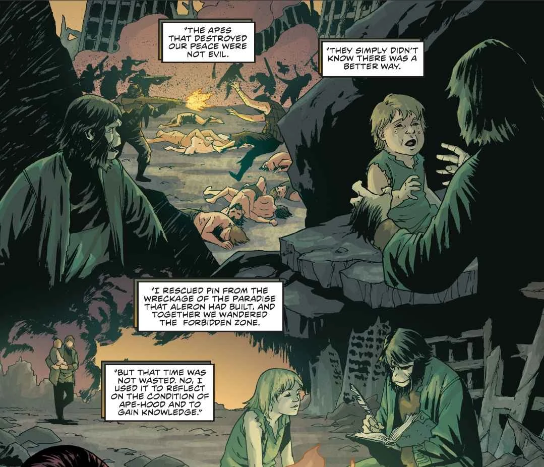Two years later, Aleron and the human Tern had settled in the Forbidden Zone and organised a rag-tag community of humans who planned to assert their rights. The humans would raid ape villages such as Capua and then have Timon sell the stolen goods and use the money to buy provisions and medicine for Aleron's worsening heart condition, as well as building up an arsenal of weapons. Prisca, a former supporter of Aleron, was under suspicion when the humans began the raids, and with the help of Doctor Milo made her way to Aleron's camp. Timon eventually betrayed Aleron to Dr. Zaius and guided an ape army to the secret lair. Zaius' army wiped out most of the humans, with Tern and his family escaping on rafts, but Aleron died destroying the passageway that led to the Forbidden Zone, trapping Timon inside for many years with a human child he had rescued.