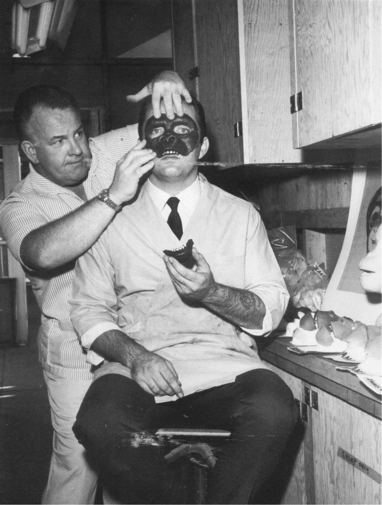 Burman remembers, towards the end of that year: "One day I was cleaning up after Mr. Nye following a makeup test. I overheard him complaining about a film Fox would be doing that he and Dick Smith were not prepared to take on. Fox wanted Bud Westmore because he had more appliance experience, having done 'The List of Adrian Messenger'. I was new and reluctant to enter a conversation between two journeymen, much less my boss. But I interrupted anyway: 'Excuse me, but John Chambers did most of that work'. Ben looked at me for a beat, then said, 'So call him!' I did, and he came in and got a script on Friday. Monday morning John pulled in and parked in front of the department. He climbed out of the car with the script under his arm. He saw me and waved for me to hurry and join him at his car. Curiously I stood before him, noticing his anxiety. He stuttered a bit as he said, 'Tommy, I'm going to win an Academy Award.' I looked into his watering eyes as he continued, 'and you're gonna be with me boy.' He pulled the screenplay out from under his arm and handed it to me. It read 'Planet of the Apes'. I had a sense we were about to make history." And he proved to be correct as Planet of the Apes was ground-breaking in terms of creative makeup. When Chambers signed on to oversee Planet of the Apes, he took Verne Langdon and Pat Newman, both from Don Post Studios, along with him, joining Tom Burman and many, many other talented makeup artists. Chambers was also right about the awards the project brought, as Burman recalls: "Although I was behind the curtain when John won the Academy Award, it was one of the highlights of my life and the beginnings of a thankful and successful career."[4]